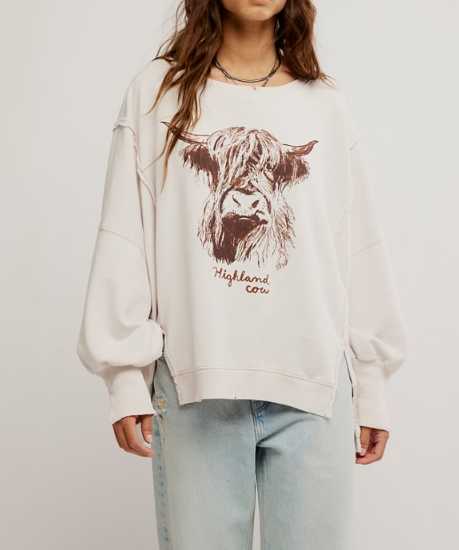 This Graphic Camden / Highland Cow Combo pullover features a slouchy, relaxed fit with a scoop neckline and dropped shoulders for effortless style. Side slits at the bottom and ribbed hems add subtle detail, while defined seaming enhances its shape. Perfect for elevating any outfit, this versatile piece pairs seamlessly with classic denim or cozy bottoms, making it an easy, go-to choice for casual comfort and style.