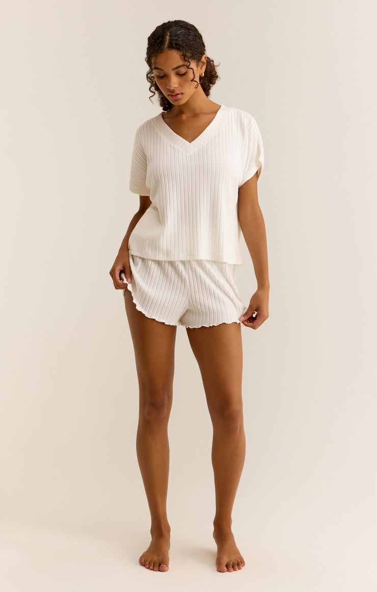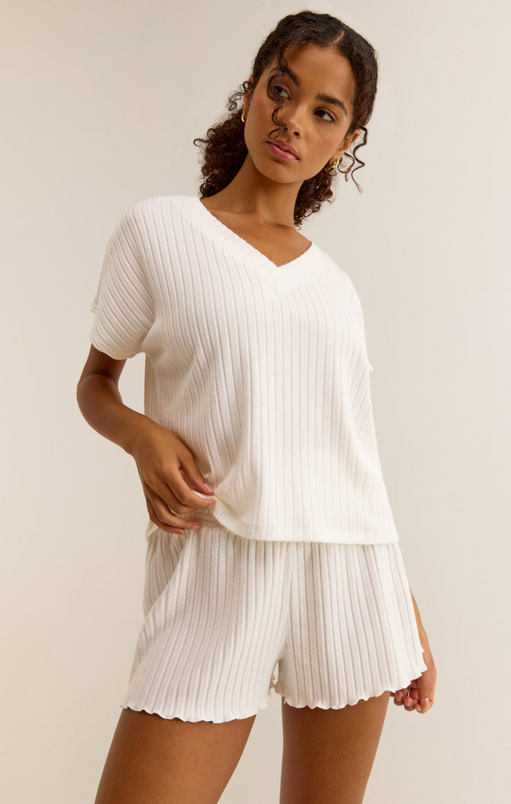 Introducing our Harper Rib V-Neck Top White. A relaxed fit with a flattering V-neckline and comfortable dolman sleeves. Made of a silky soft knit material for ultimate comfort. Elevate your wardrobe with this must-have top.