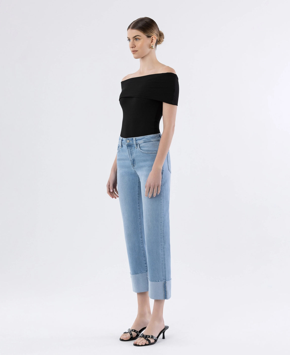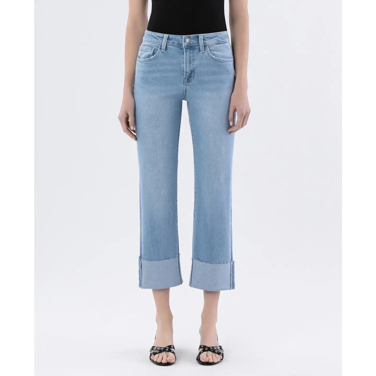 Introducing T6657 - Flying Monkey's High Rise Cuffed Straight jeans. With a flattering high rise and large cuffs at the ankle, these light wash jeans are perfect for any occasion. Say goodbye to uncomfortable skinny jeans and hello to a relaxed, straight leg fit. Upgrade your denim game today.