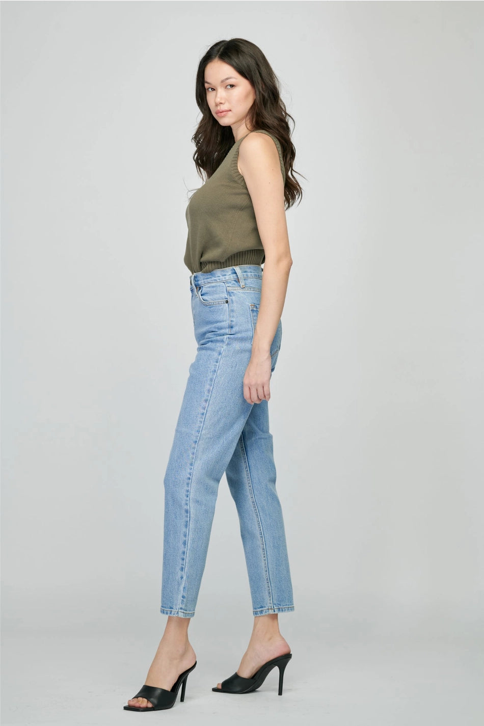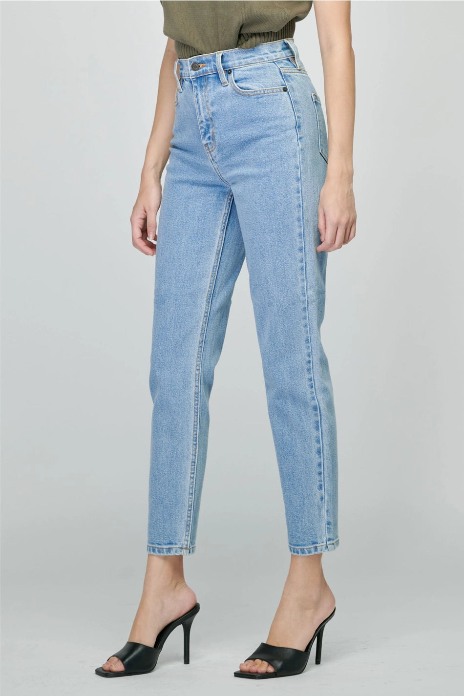 Elevate your style with our High Rise Mom Crop Jean. These light wash jeans provide a relaxed, comfortable fit with a straight-leg design. Featuring five pockets and a zip fly closure, these ankle-length jeans are the perfect blend of comfort and style. Made with 99% cotton and 1% spandex for a comfortable and stretchy feel. Inseam measures 27 inches and the rise is 11 1/2 inches for the perfect fit.