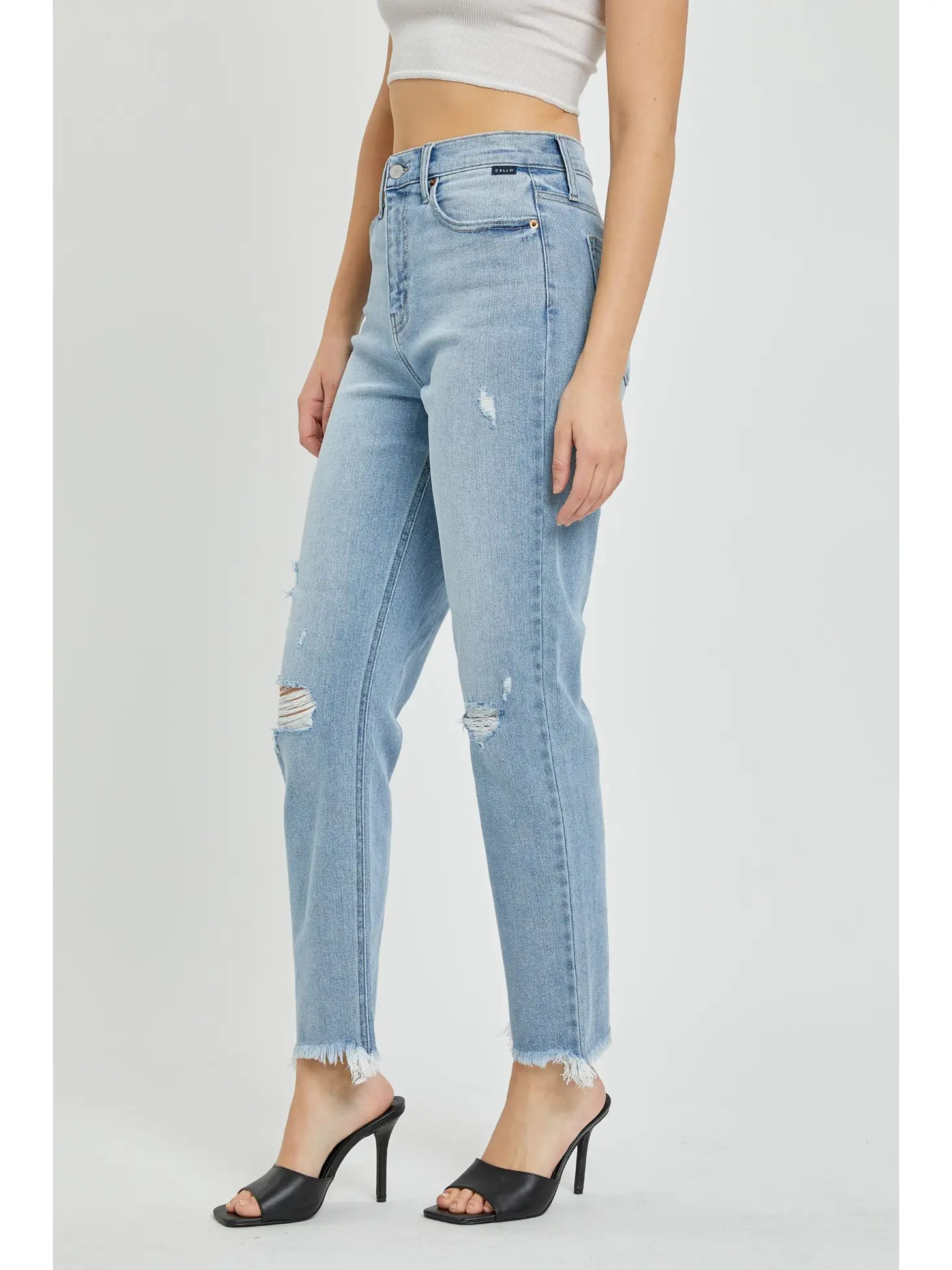 Introducing our High Rise Mom Jeans - the perfect blend of comfort, style, and versatility. Crafted from light denim, these jeans offer a refreshing twist on the classic mom jeans silhouette. With a high-rise, light distressing, and frayed hem, these jeans hug your curves in all the right places. Designed for all-day comfort and featuring 5 pockets, stretchy fabric, and a 28" inseam with an 11.5" rise. Don't compromise on style or comfort - get yours today!