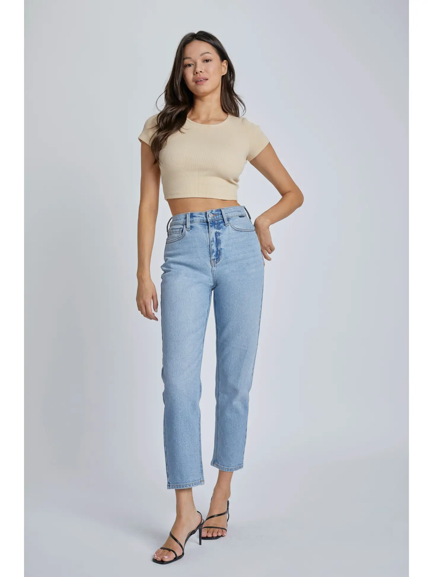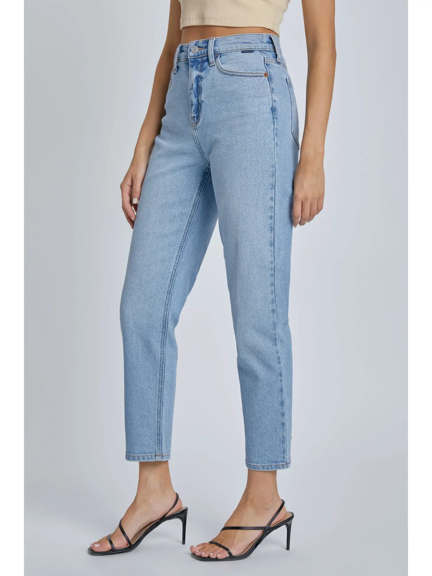 Upgrade your denim game with our High Rise Mom Jean. Made with lightweight, drapey cotton fabric, these 2000's inspired jeans feature a tapered wide-leg shape and a classic medium wash. The high waist and clean cut add a flattering touch while the 5 pockets provide practicality. Imported with inseam of 28" and rise of 11 1/2". Fabric content: 99% Cotton 1% Spandex.