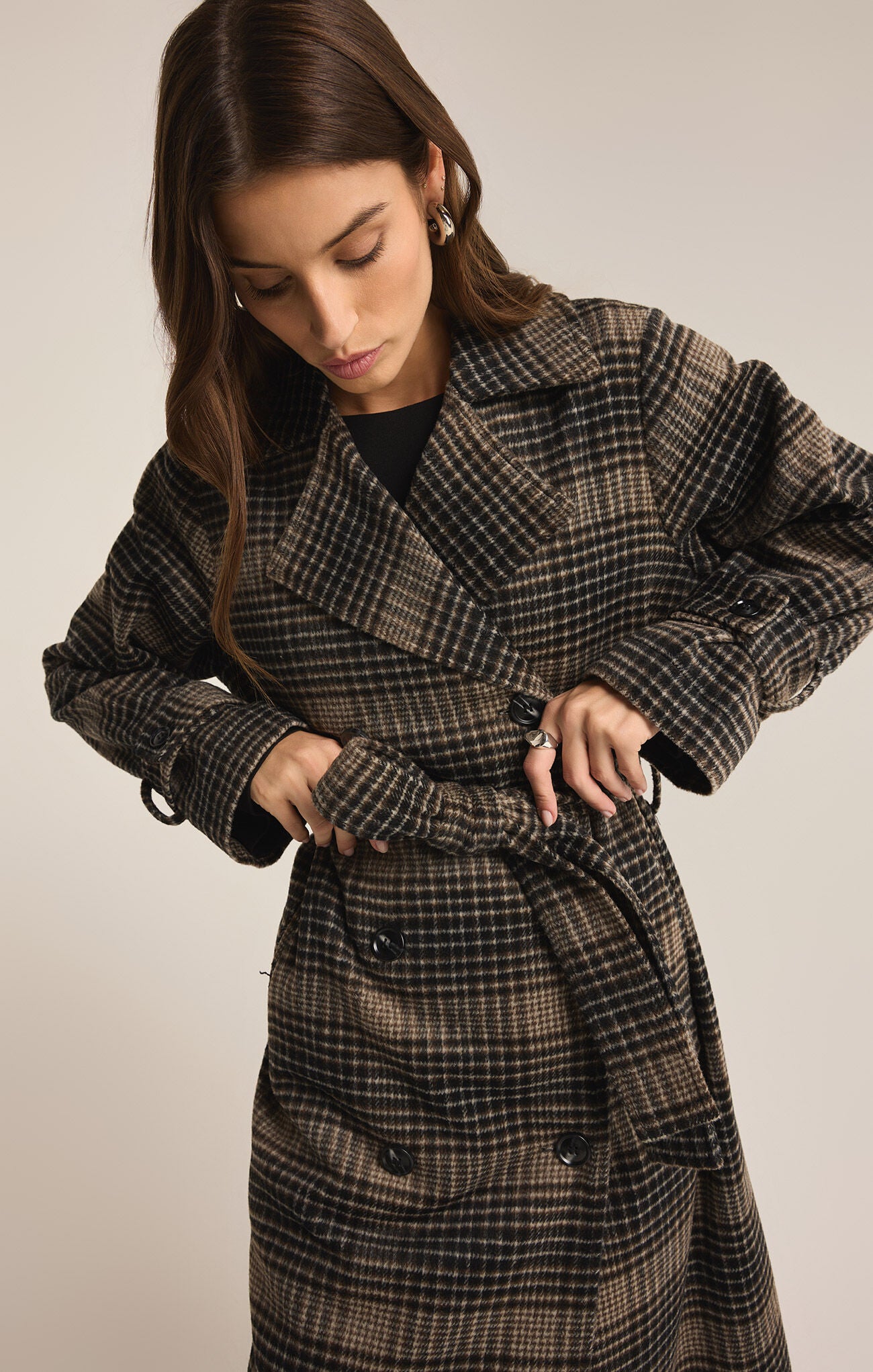 Stay stylish and comfortable in our Jackie Plaid Trench. Featuring a classic collar and long sleeves, it's perfect for any season. With a midi length and button front, it's both practical and chic. Plus, the flap pockets and midweight fabric make it a must-have for your wardrobe. Available in Latte, this regular fit trench is a versatile and timeless piece.