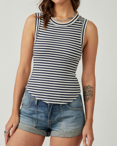Your new go-to essential tank in a soft cotton fabric with a stretch feel. It is a body-hugging tank with a stripped print and rounded hem.