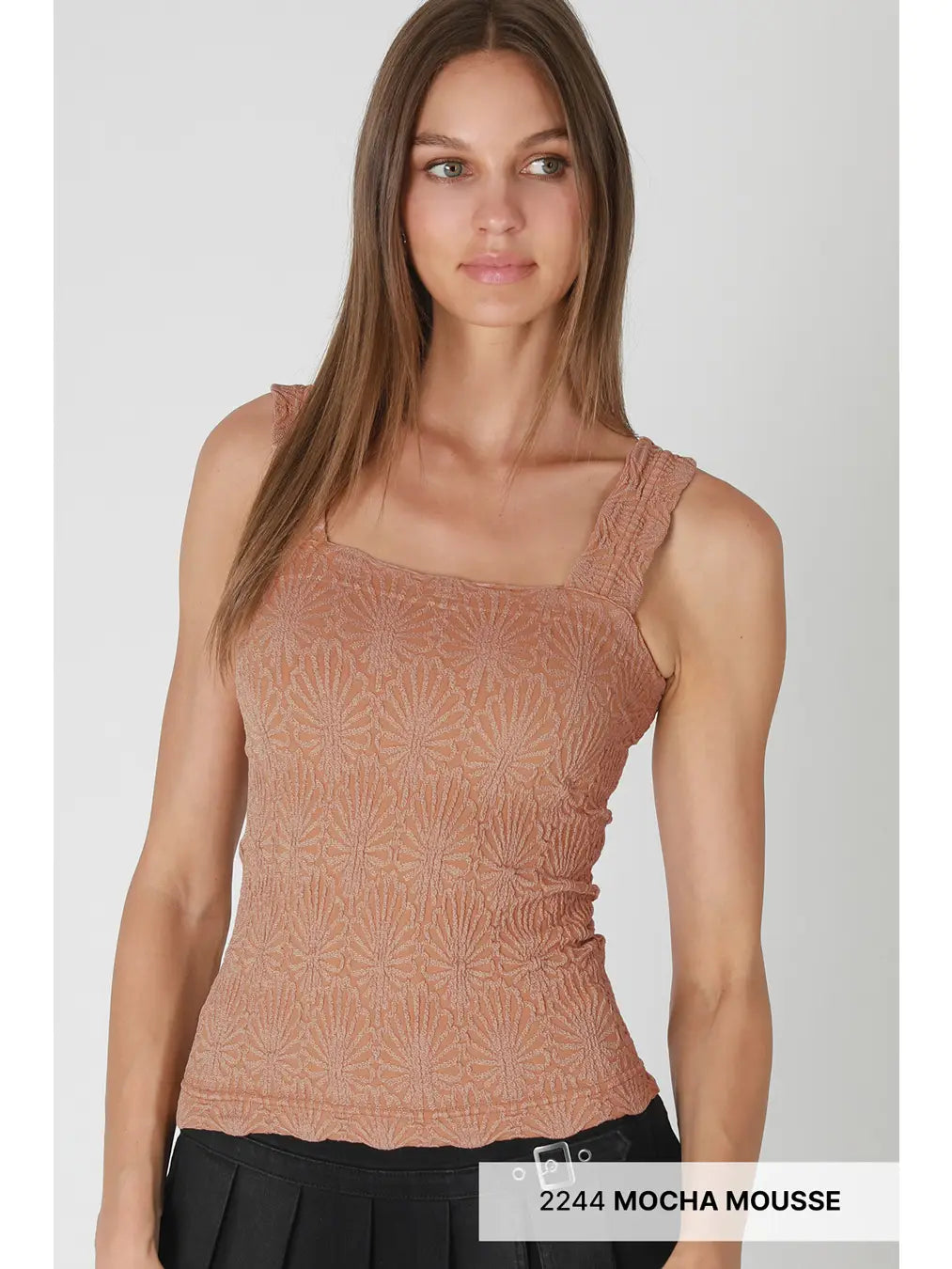 This lace textured square top, made in USA, is perfect for any occasion. With its one-size fit and fabric blend of 92% nylon and 8% spandex, it offers a comfortable and versatile option for any outfit. The floral lace texture adds an elegant touch to any look.