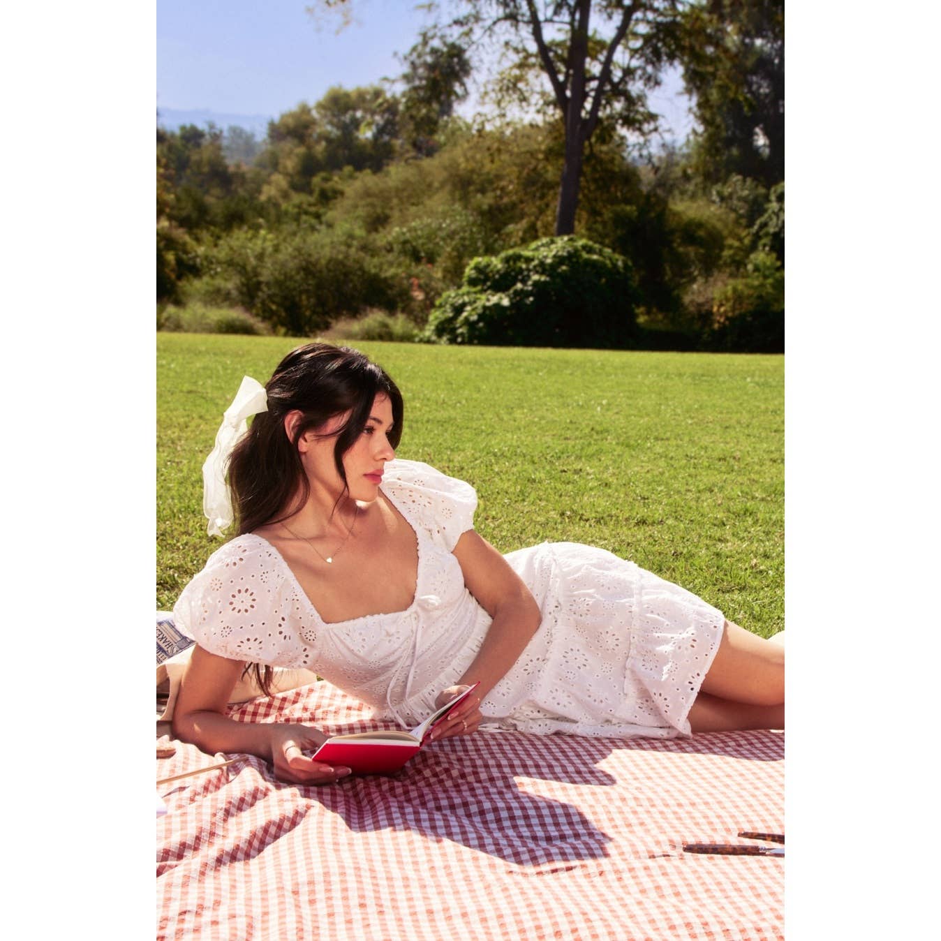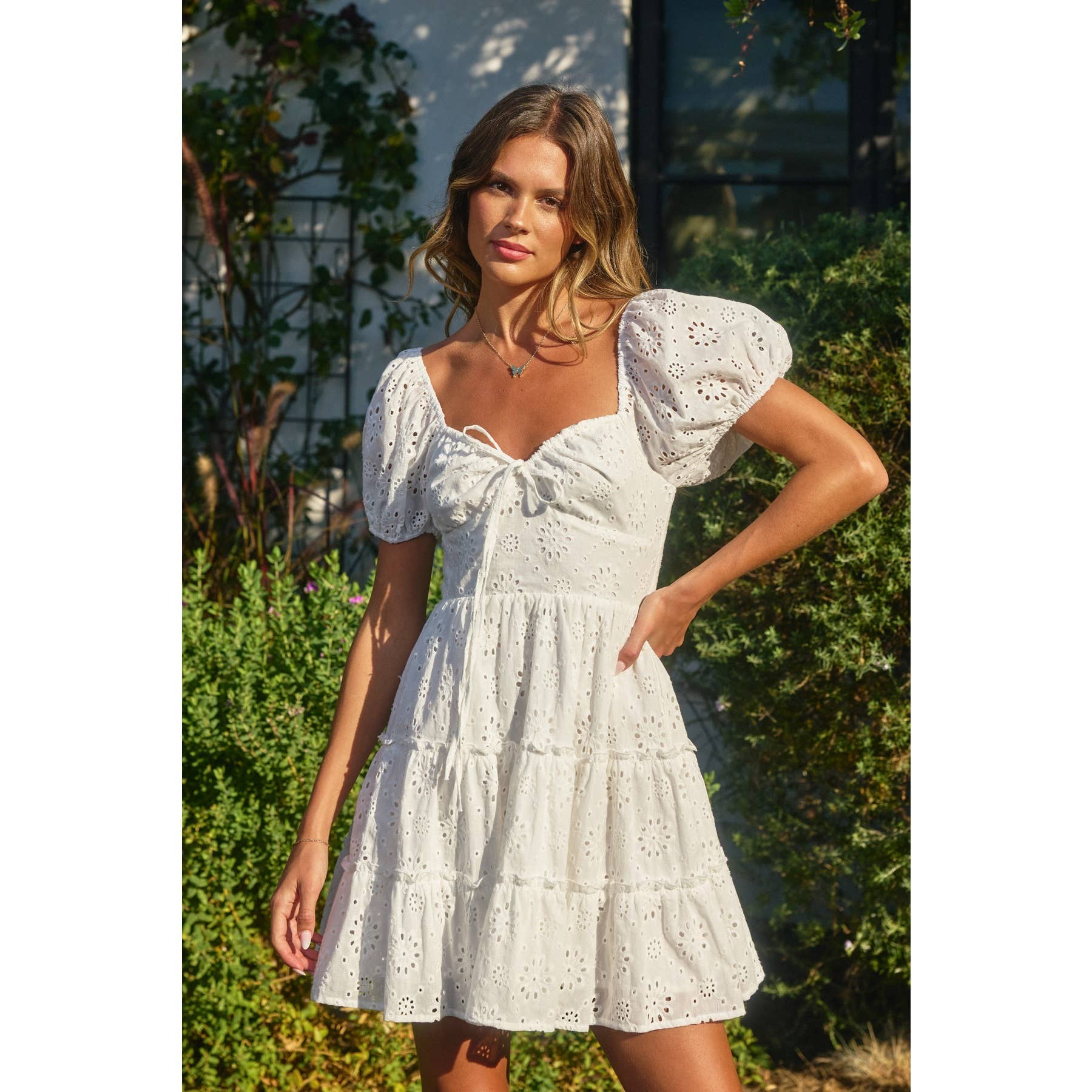 Eyelet puff sleeve mini dress. The editorial model and ecomm model are 5'8".They both are wearing size Small. - Square neckline - Cup detail with drawstring fastening on the neckline - Ruffle tiered A line skirt - Smocked back panel with hidden center back zipper closure