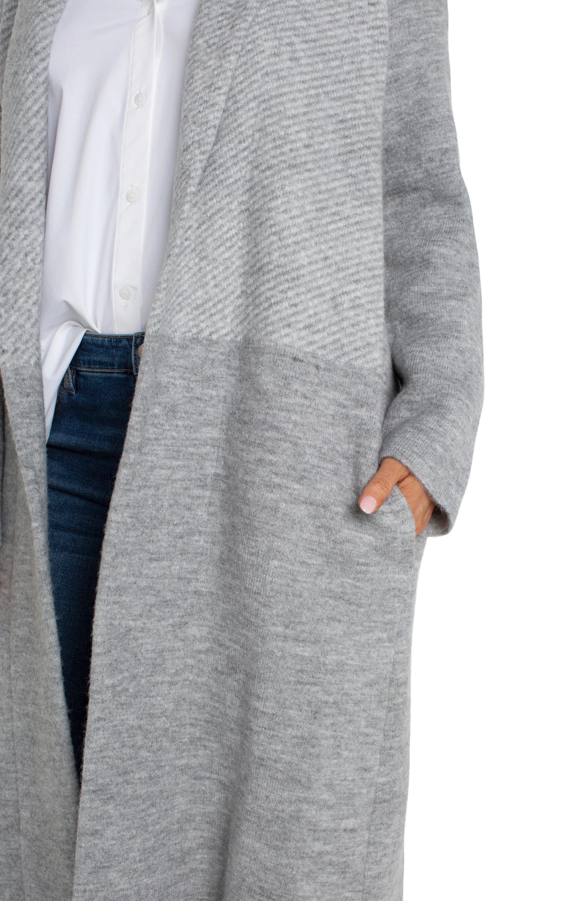 Introducing our Long Sleeve Sweater Coatigan. The perfect combination of a coat and a cardigan, providing both warmth and style. With a knee-length design and open front, this coatigan is perfect for layering on colder days. The stylish grey colorblocking adds a touch of sophistication to any outfit.