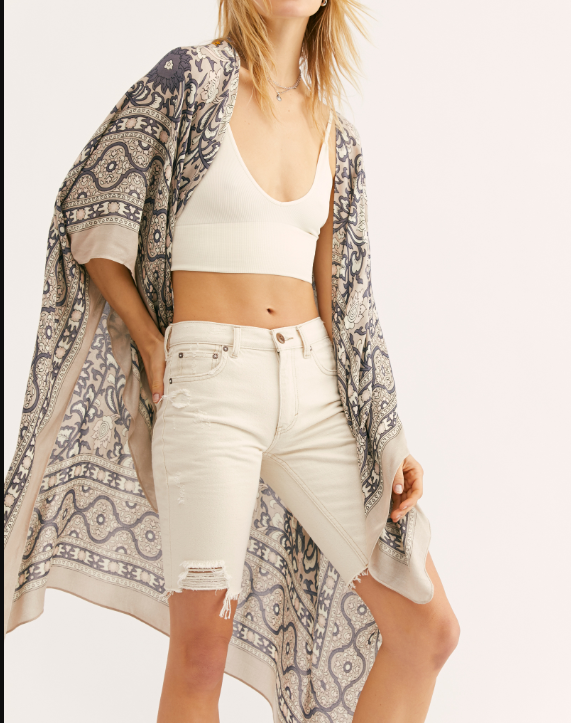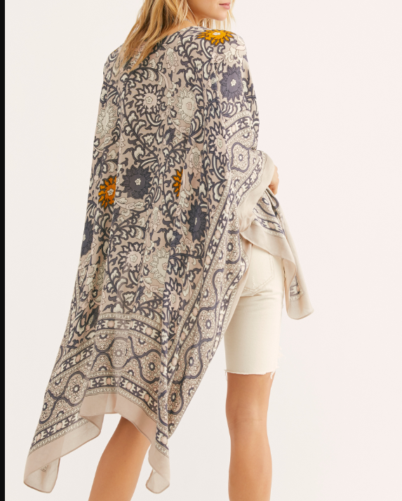 Lightweight kimono featured in a colorful pattern with a border print. Make a statement with this bold style.