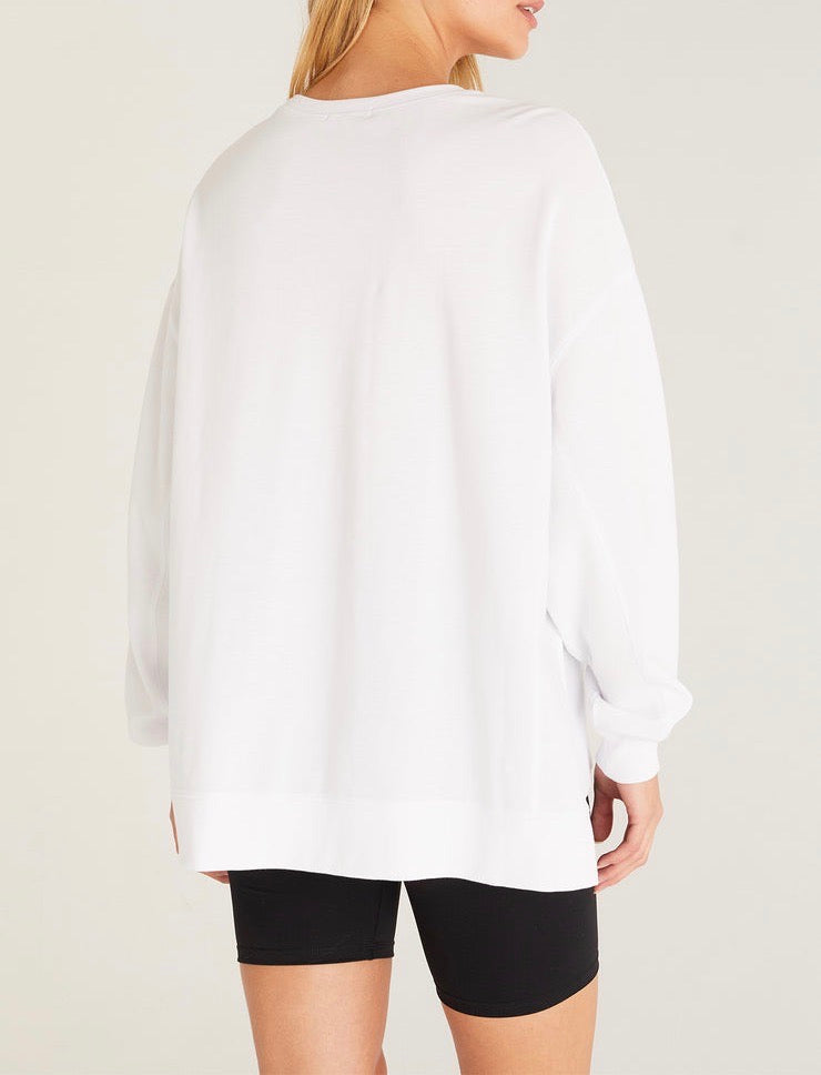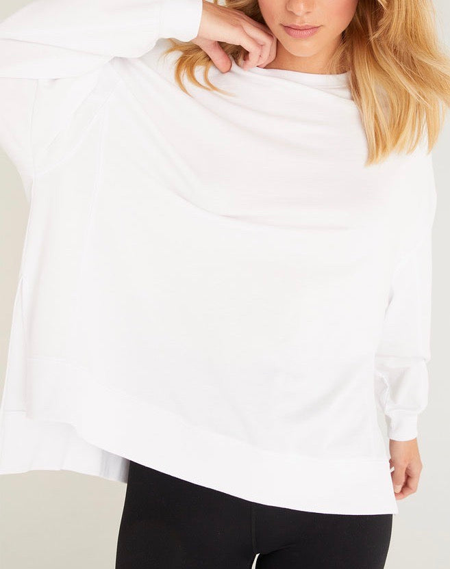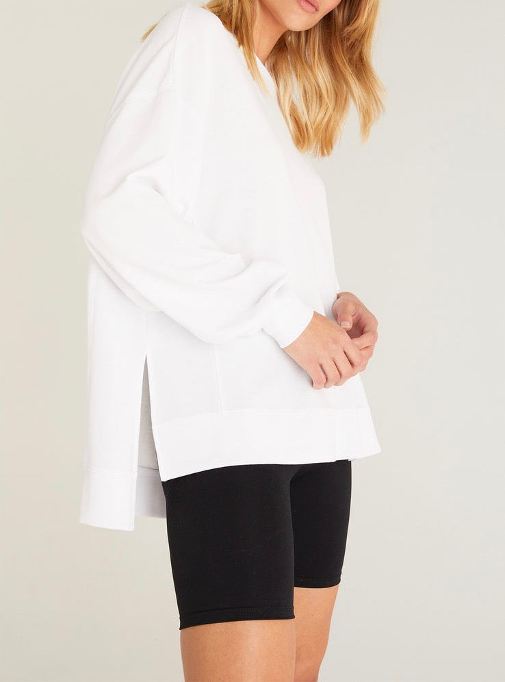 Get away in the Modern Weekender. Crafted with a Baby French Terry knit fabric, it features an oversized fit with a step-hem and slit sides for a modern silhouette. Perfect for your weekend getaway, this piece provides comfortable essentials for stylish yet effortless glamour.