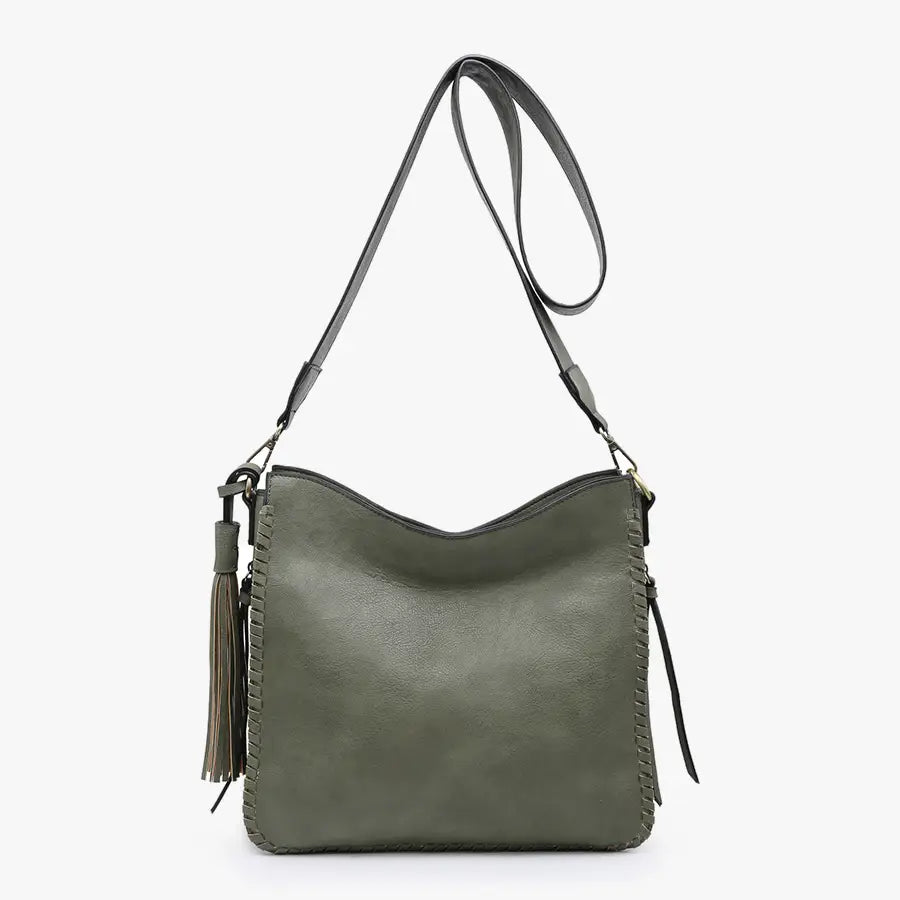 The Nina Whipstitch Crossbody is the perfect accessory for any ensemble. Crafted from premium vegan leather, this handbag features a detachable guitar strap with decorative side tassel and zipper top closure for secure storage. The interior includes inner zip and slip pockets along with a back zipper pocket for extra organization, as well as side concealed pocket for easy access to personal items. Finished with whipstitch detailing for a stylish look, this bag has dimensions of 13'' l x 4'' d x 11'' h.