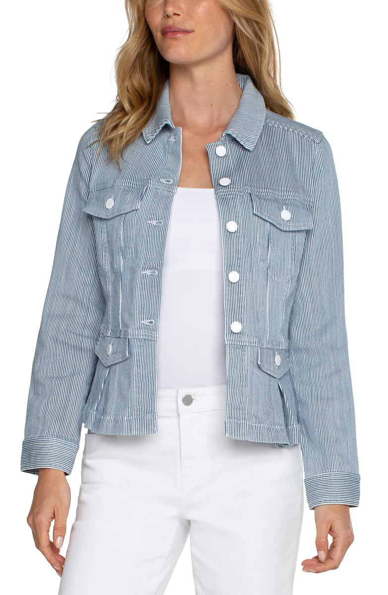 Upgrade your wardrobe with our Peplum Jacket. The Chambray Stripe adds a touch of elegance, while the cotton blend ensures superior comfort. Complete with a button-front design, this jacket is perfect for any occasion.