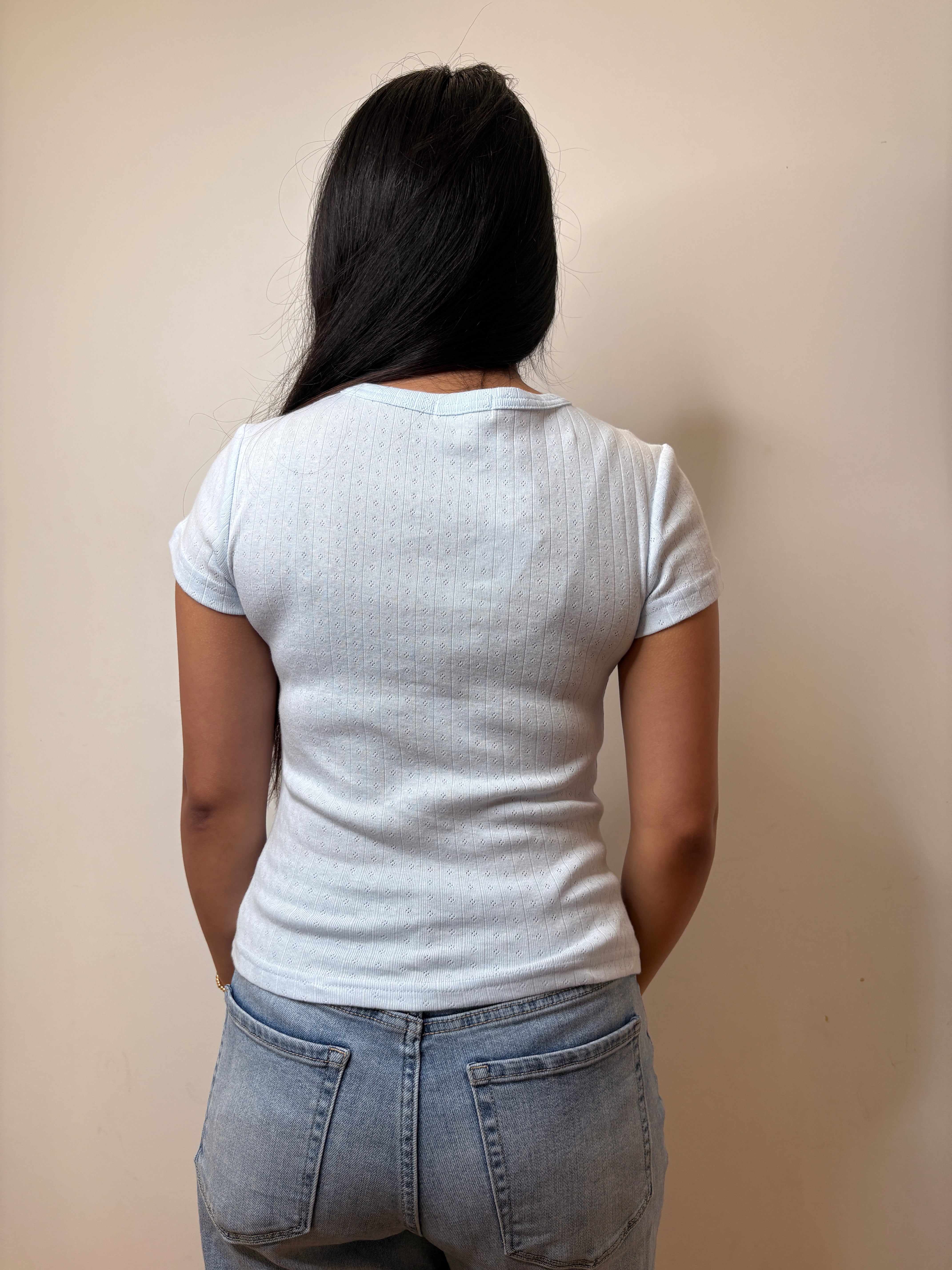 Expertly crafted for maximum comfort, this Pointelle Baby Tee in Ice Blue is a must-have. Made from 100% cotton, it is soft, breathable, and gentle on delicate skin. The delicate pointelle design adds a touch of elegance, making it perfect for everyday wear.