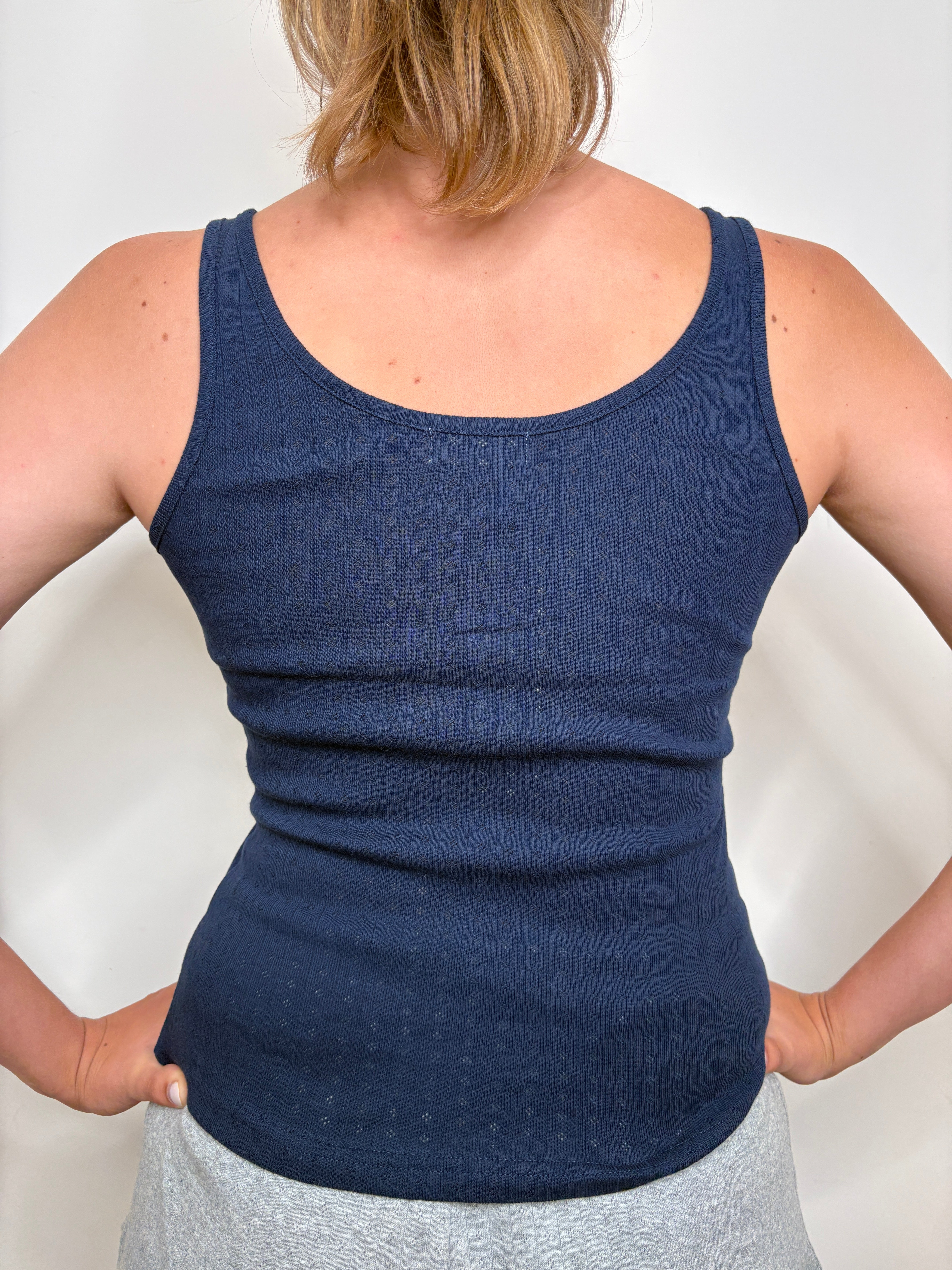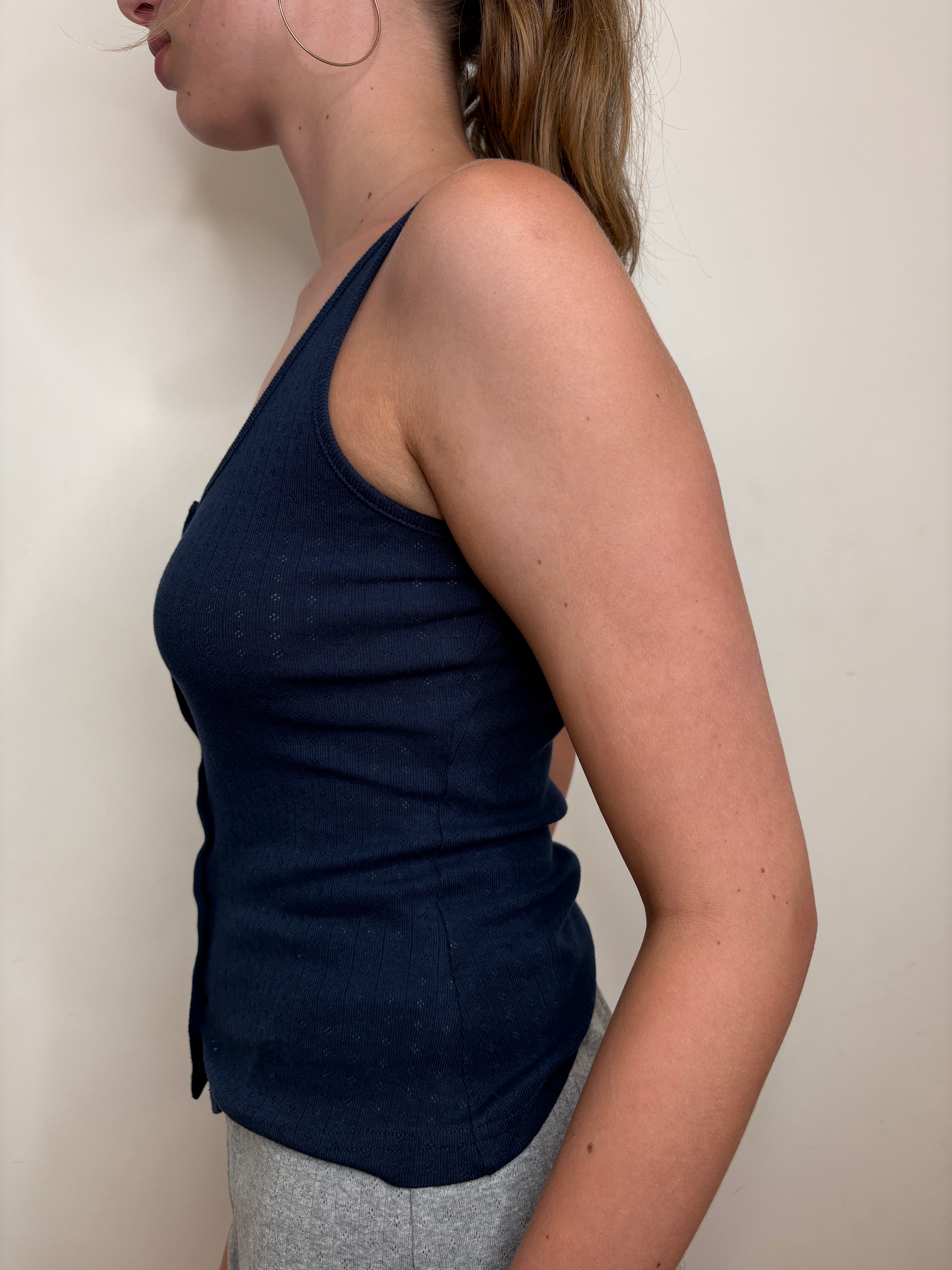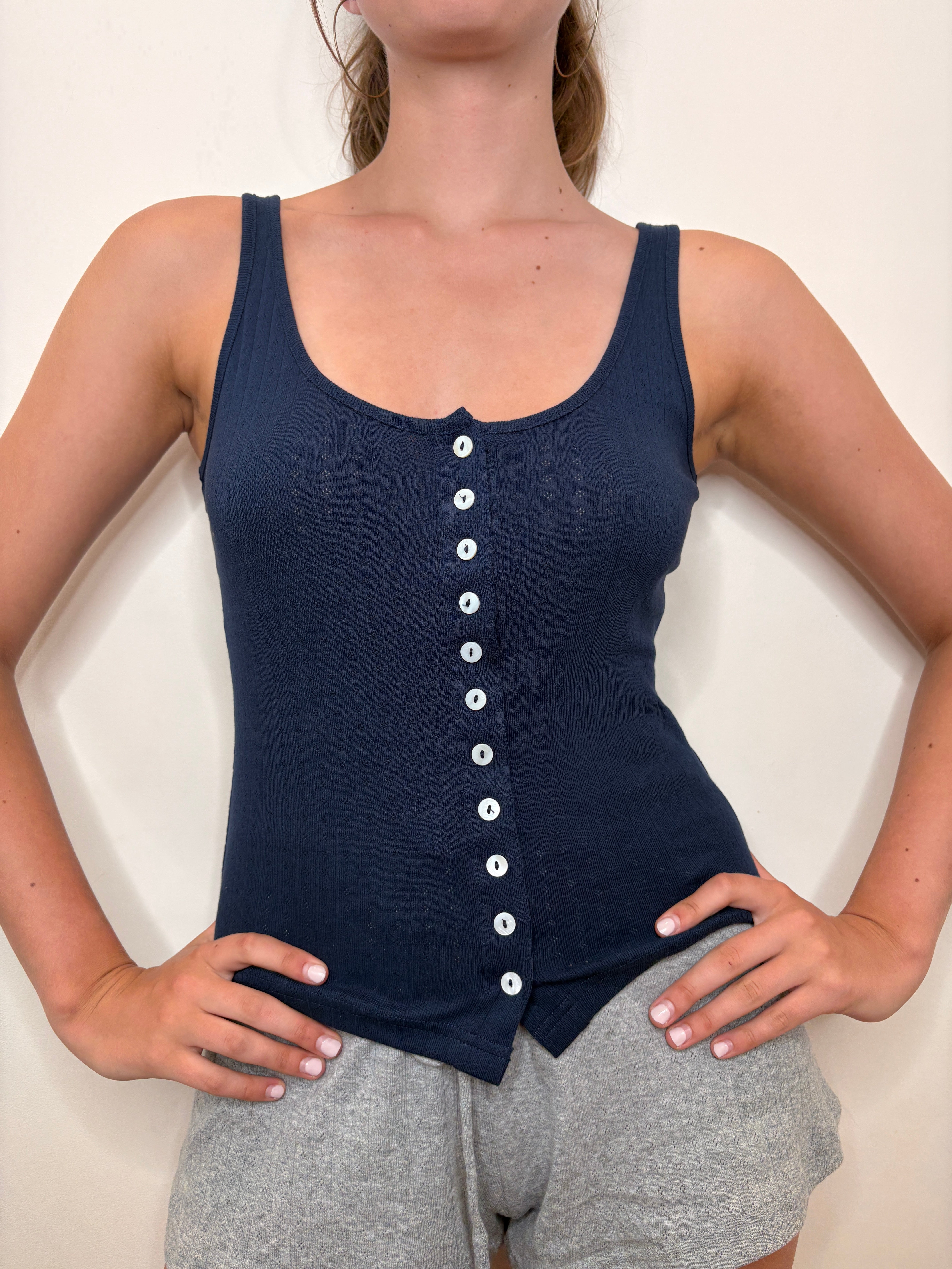 Add this must-have Pointelle Button Tank to your wardrobe for ultimate comfort. The soft fabric and stylish design make it a versatile piece that can easily be dressed up or down. A perfect option for any day, this tank is a closet essential.