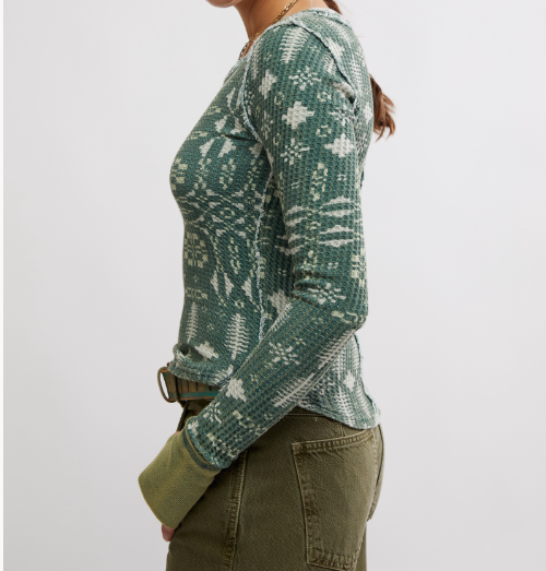 Slim fitting and stylish, the Pretty Little Thermal/Pine Combo is designed for comfort and versatility. Made with soft cotton fabric and featuring printed detailing, this hip-length top also boasts a crew neckline, raw seaming, and exaggerated cuffs with thumbhole detail. Perfect for any occasion with its round hemline.