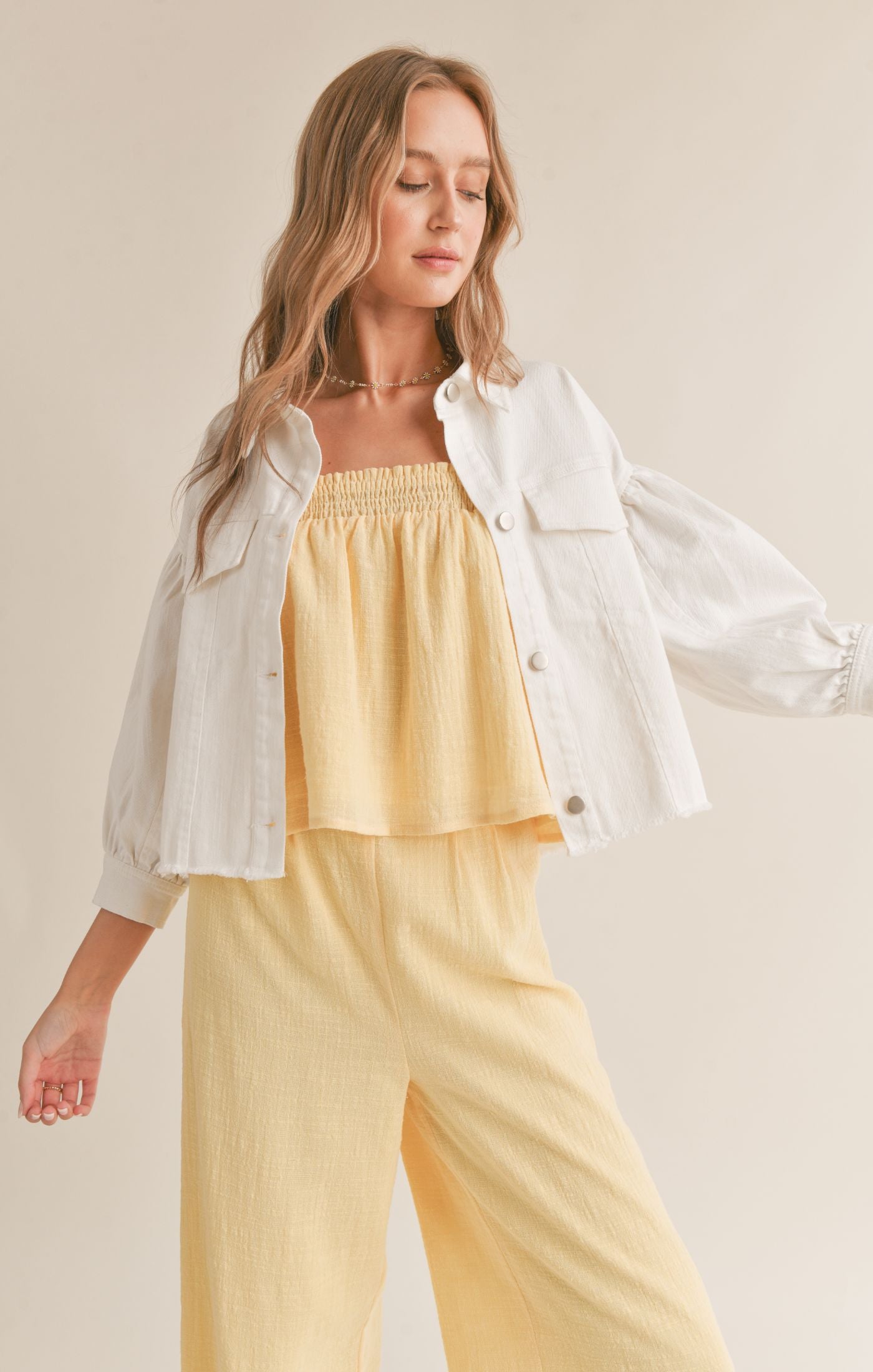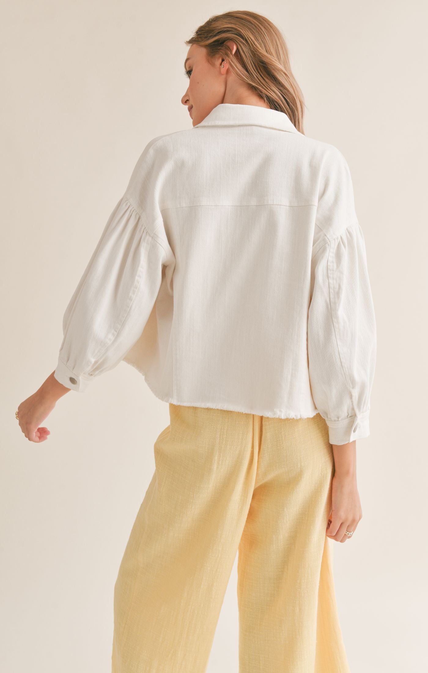 Elevate your spring wardrobe with our Puff Sleeve Denim Jacket. Crafted in timeless white denim, this jacket features a drop shoulder and exaggerated sleeves for a modern twist on a classic piece. Perfect for effortlessly adding style to any outfit.