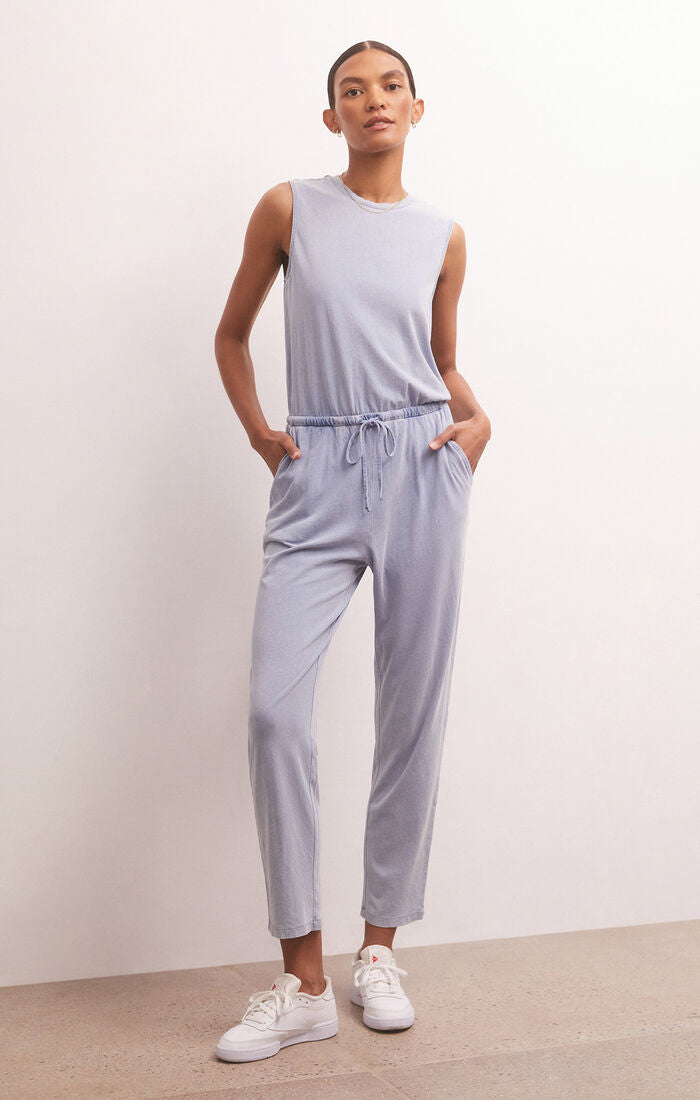 This jumpsuit is a step above the rest! The Rain Knit Denim Jumpsuit is made with the denim look you love, in a heavier weight Cotton Knit Jersey fabric, given a mineral wash. You'll love the keyhole back detail and elastic drawstring waistband that blousons over for a flattering fit. Fabric Content: 100% Cotton