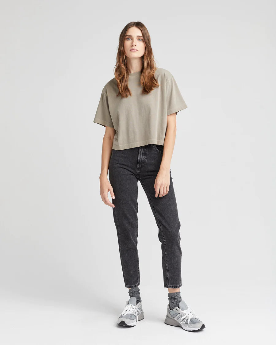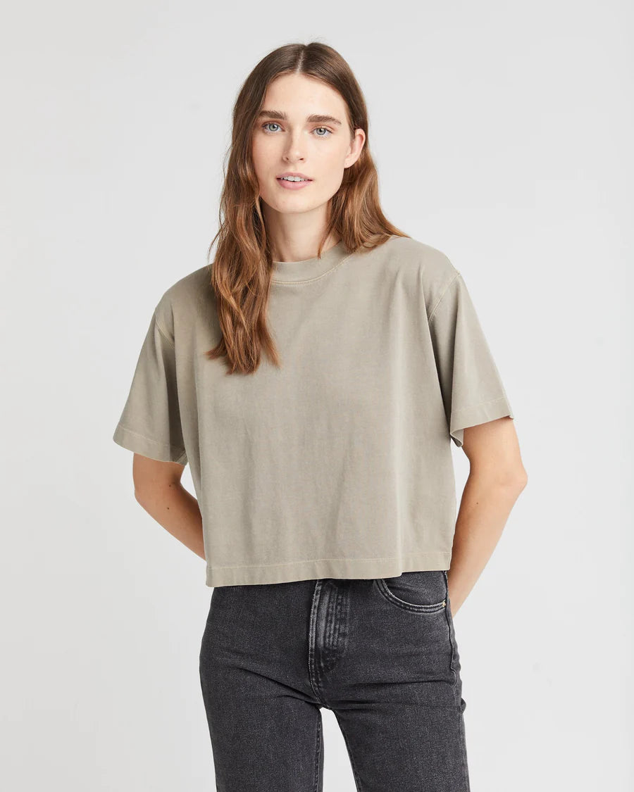 The Relaxed Crop Tee offers an effortlessly chic, relaxed fit with dropped shoulder seams and an oversized neck rib. Its unique pigment dye process ensures that each tee has its own one-of-a-kind coloring, making it a truly special addition to any wardrobe.