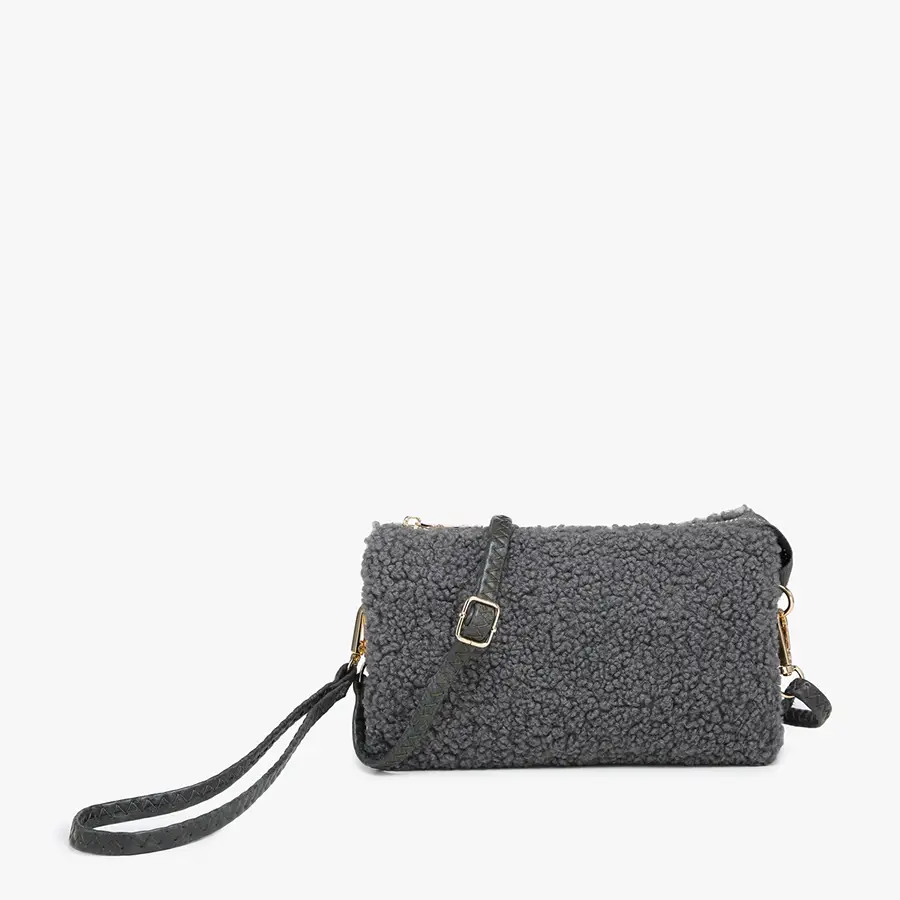 Get the best of both worlds with the M013SHP Riley Sherpa 3 Compartment Crossbody/Wristlet. Featuring a top zipper closure, 2 slip pockets, 6 cardholders, and a detachable wristlet and shoulder strap, this bag offers both convenience and style. Made of soft sherpa material with gold or silver-tone hardware, elevate your outfit with this cozy and chic accessory.