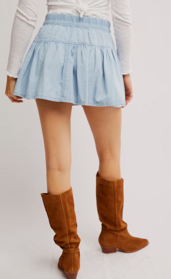 The Roselle Denim Mini in Going Steady features a high-rise fit with a flattering A-line silhouette. Designed with an exposed button fly closure and placket seaming at the yoke, it offers unique detailing. The dropped waist adds shape, while the drawstring closure at the waist ensures a customizable fit. Perfectly versatile, this skirt pairs boldly with tall boots or casually with sporty sneakers, making it a stylish staple for any wardrobe.