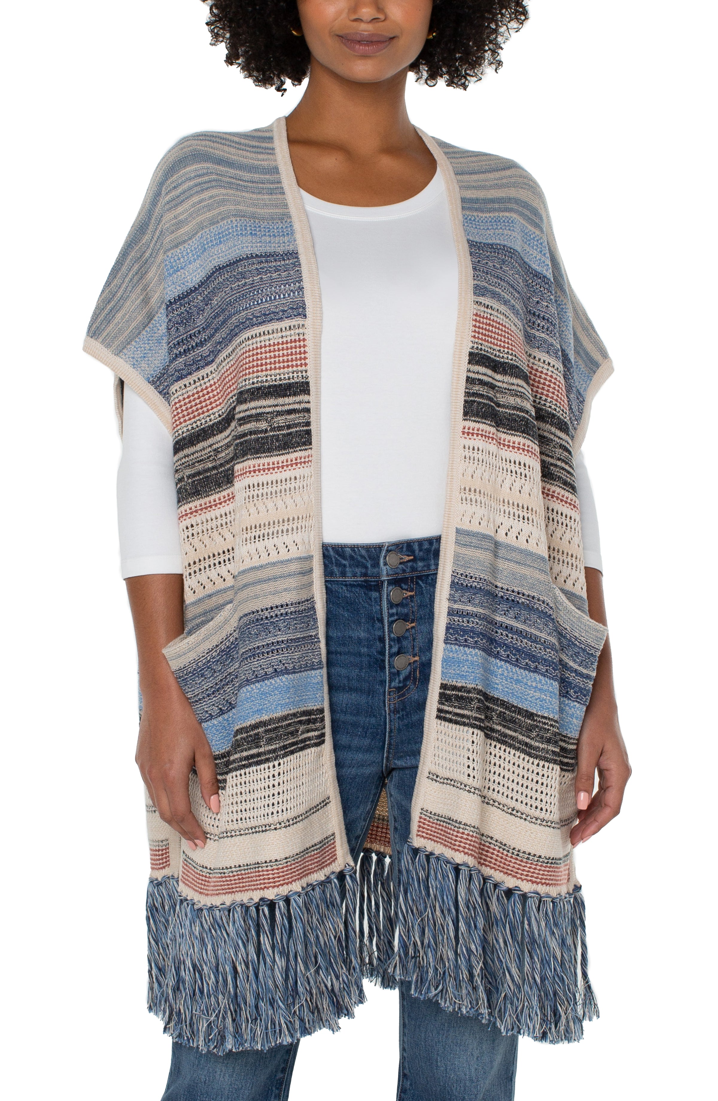Stay chic in any season with the Sleeveless Cardigan with Fringe. This lightweight poncho-style sweater is an elegant addition to any outfit. Crafted from a luxe blend of cotton and acrylic, it is sure to become a go-to item in your wardrobe. With a subtle hint of fringe detail, this sleeveless cardigan will help you make a statement no matter the occasion.