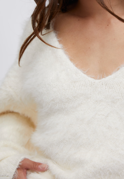 Introducing the Sparrow Pullover in Ivory. This fuzzy, cozy sweater is perfect for chilly days with its v-neck and easy pullover style. Stay warm and stylish this season with this must-have addition to your wardrobe.