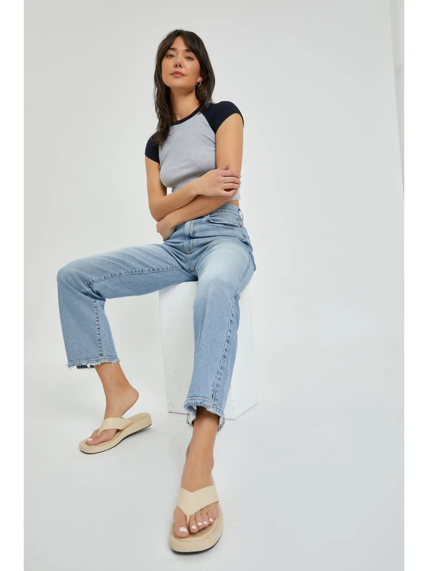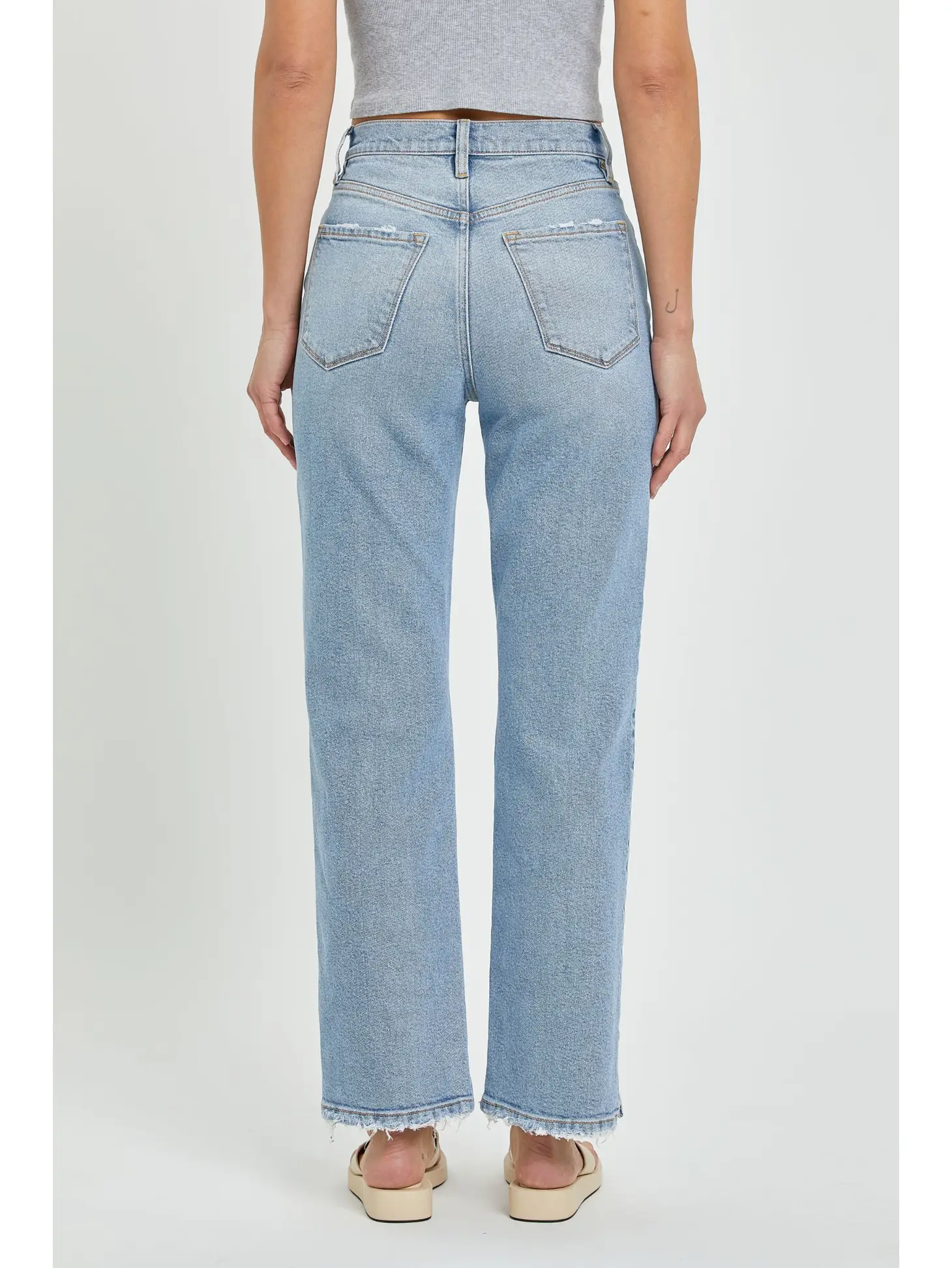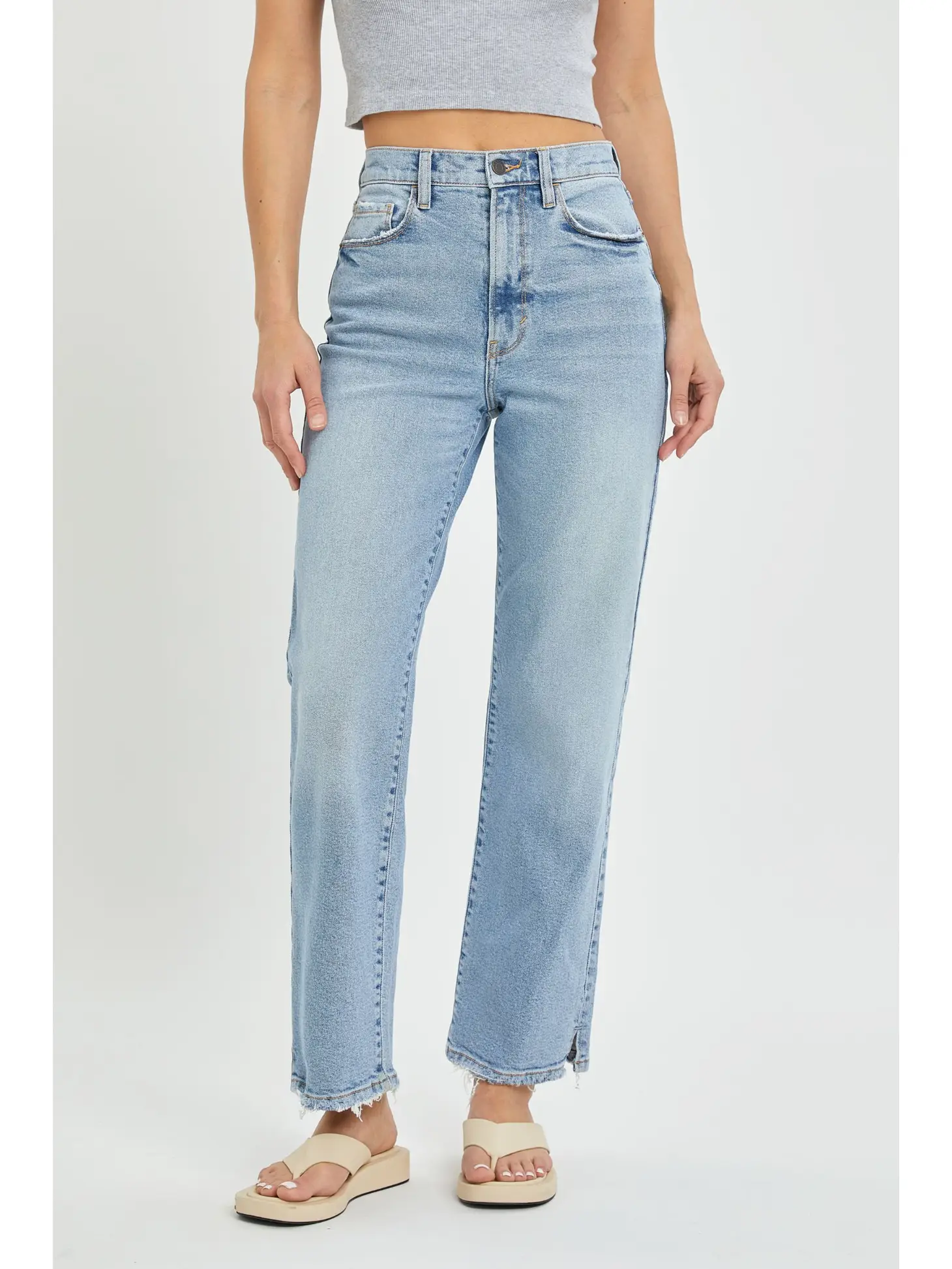Elevate your denim game with our Super High Rise Dad Jean with Mini Slit. These high-waisted jeans offer ultimate comfort and style with a subtle mini slit detail. Featuring 5 pockets, belt loops, and a light denim fabric, these jeans provide a modern twist on a '90s classic. Inseam: 31", Rise: 12". Made from 99% cotton and 1% spandex for optimal fit and durability.