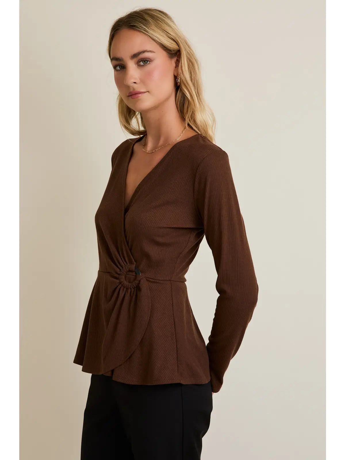 Surplice Long Sleeve O-Ring Trim Detail Flare Hem Top / Brown