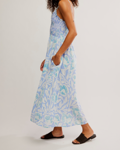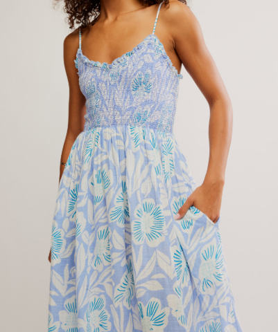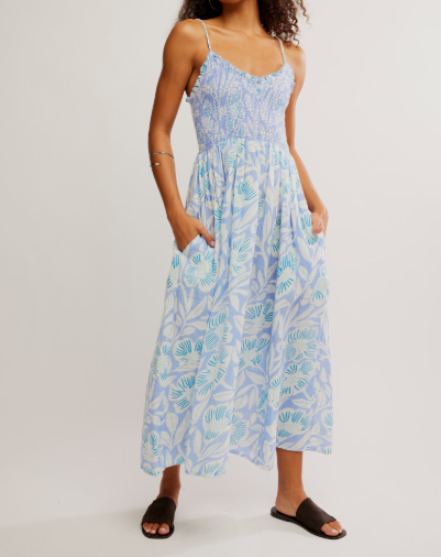 Looking for a versatile and stylish midi? Look no further than Sweet Nothings Midi / Blue Vista Combo. With a fitted bodice and A-line hem, this dress flatters every figure. The soft cotton fabrication and smocked bodice provide all-day comfort, while the scoop-neckline and ruffle trim add a touch of femininity. Perfect for any occasion, pair it with flats or sandals for a chic look.