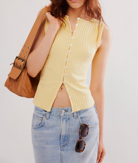 Effortlessly stylish, the Tilly Vest in Mellow Yellow features a slim and relaxed fit. Crafted from a ribbed knit fabric, this vest has a comfortable stretch and is designed with a scoop-neckline and button-front closures. Perfect for any occasion, this versatile vest is a must-have in your wardrobe.