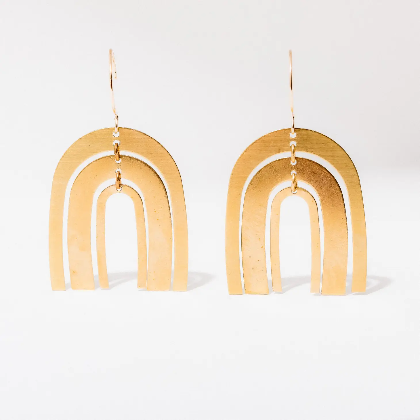 Show off your style and your friendship with Tina Earrings. These eye-catching earrings are crafted from 14k gold fill earwires and feature three brass u-shapes arranged in a rainbow for a unique and vibrant look. At 2.5 inches long, Tina Earrings will add a stylish touch to any outfit.