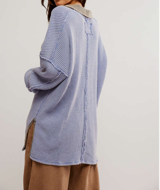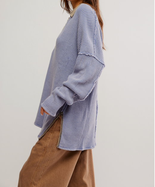 Introducing the Travis Polo in Dutch Blue! This oversized polo features a cozy waffle knit, perfect for staying comfortable and stylish. With a collared neckline and raw seam detailing, this polo is a must-have for any wardrobe.