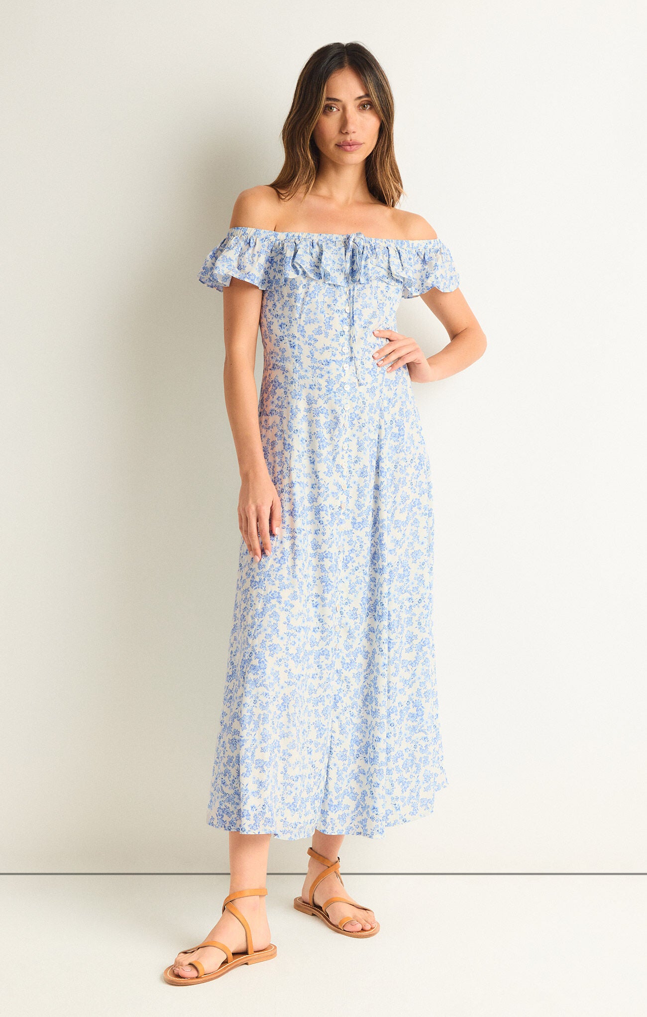 Upgrade your wardrobe with our Veda Tropez Floral Dress. The off the shoulder ruffle neckline and fitted bodice provide a flattering look, while the smocking detail at the back ensures a comfortable fit. Lined for added elegance, this 44" dress in feather crepe will easily become your go-to for any occasion."