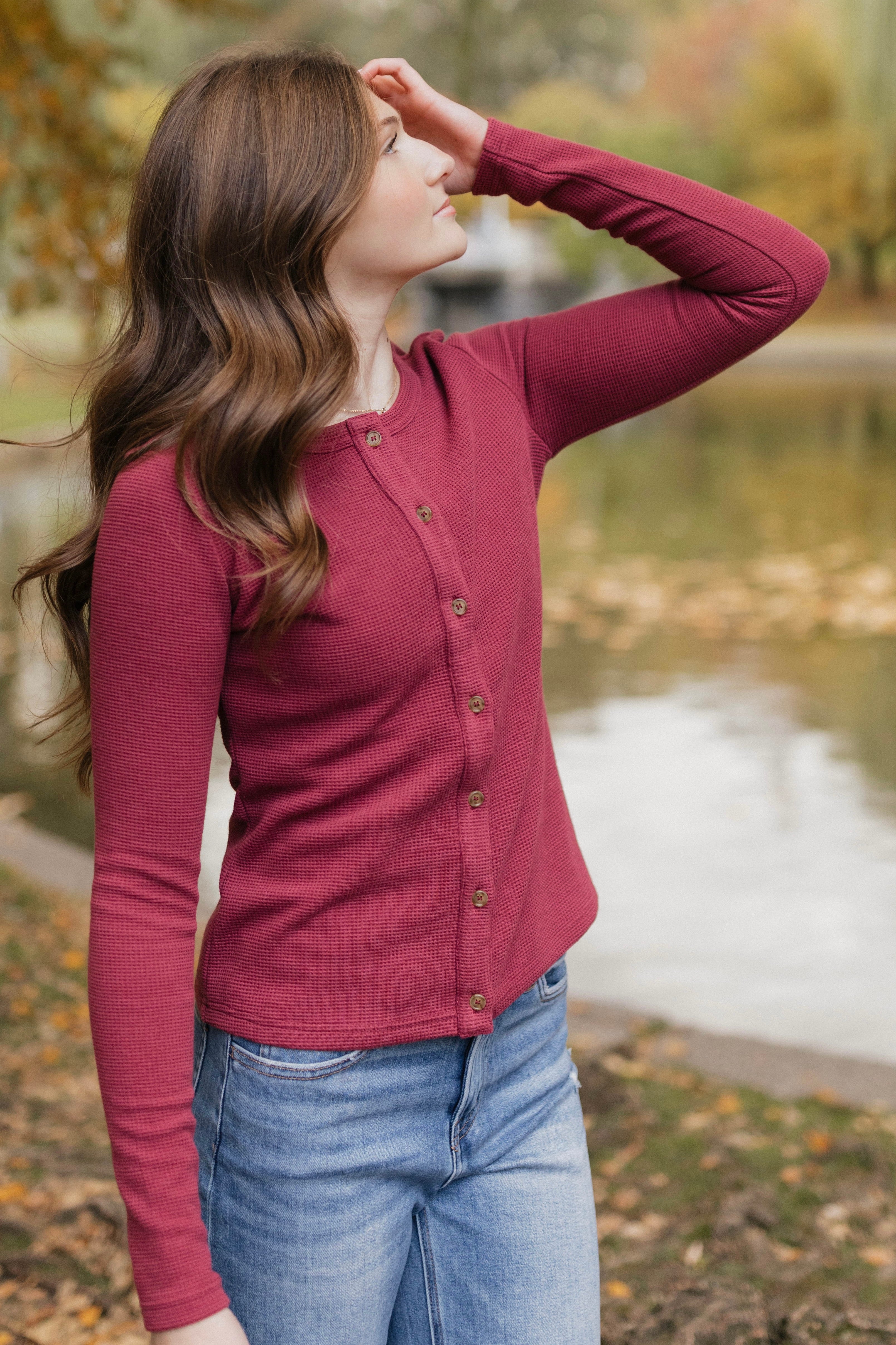 Introducing our Mulberry colored Waffle Button Henley. Made from thick and cozy waffle fabric, featuring convenient buttons for easy wear. Stay warm and stylish in this comfortable henley. Model is wearing a size Small.