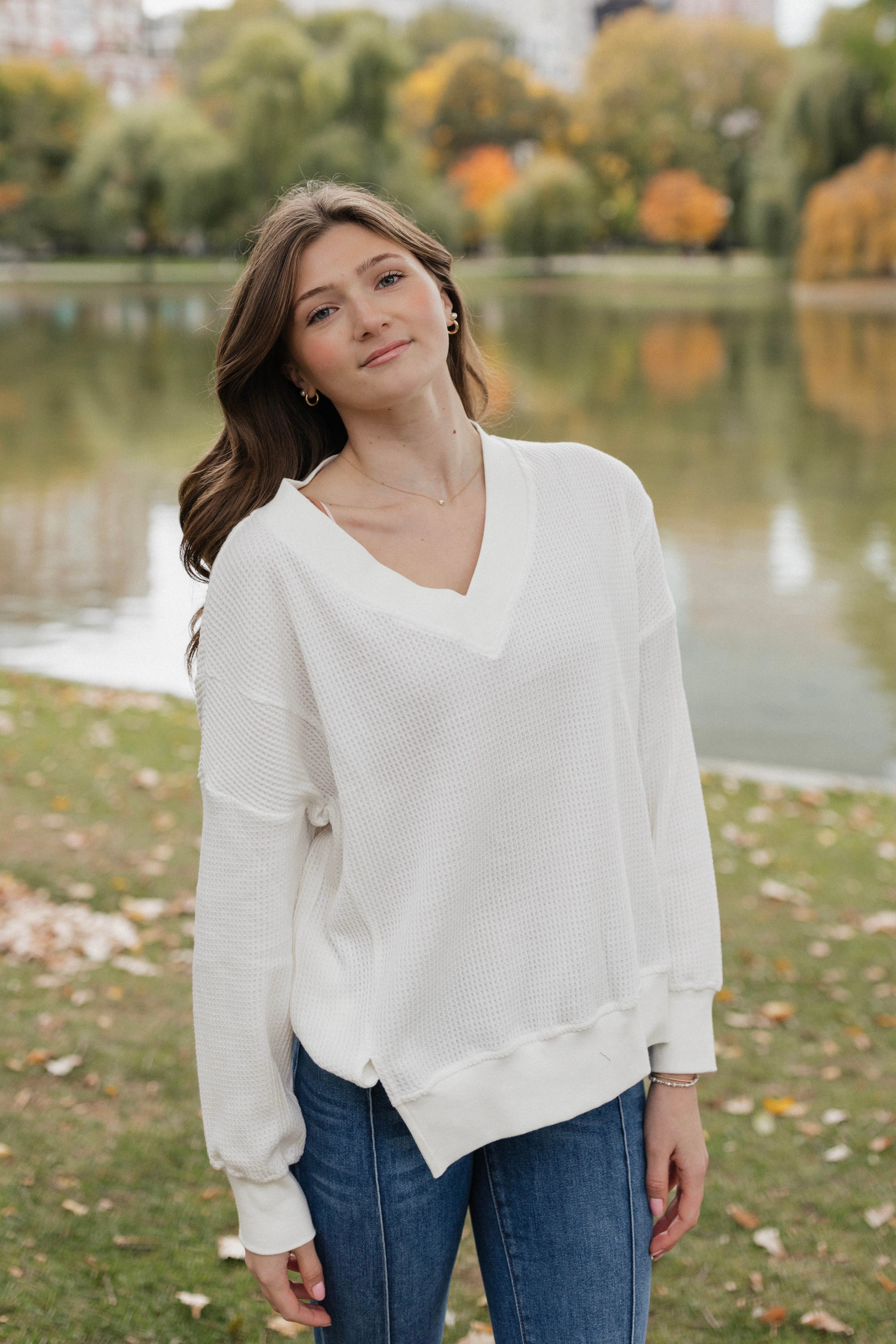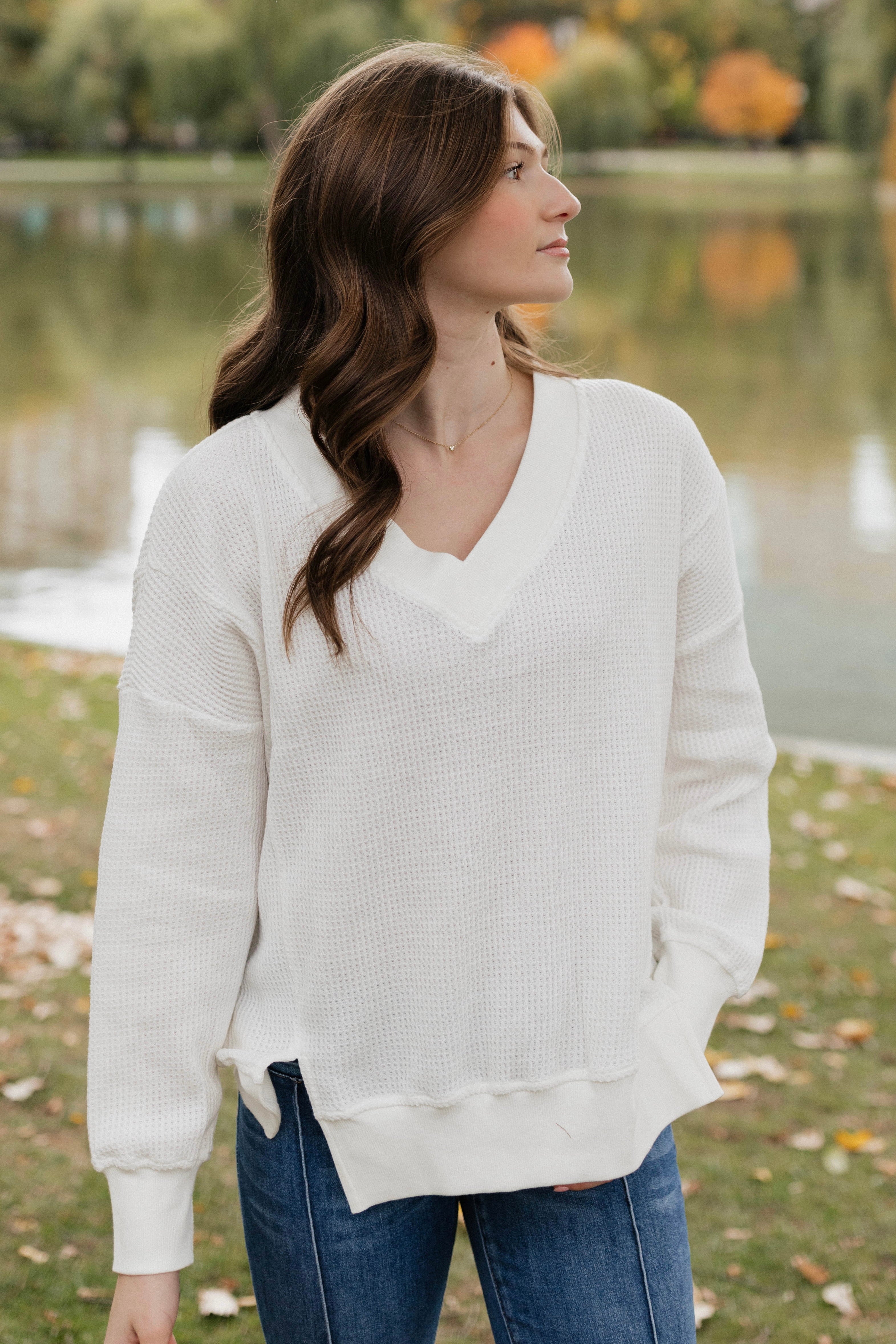 Elevate your wardrobe with our Waffle V Neck sweatshirt. Made with cozy waffle fabric, this sweatshirt features a stylish v neck, ribbed collar, and ribbed hem with notches for added detail. Stay comfortable and fashionable all day long.